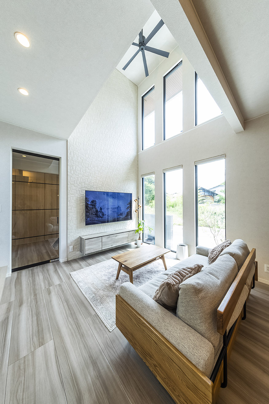 吹き抜けの開放感と光に包まれる、心地よいリビング