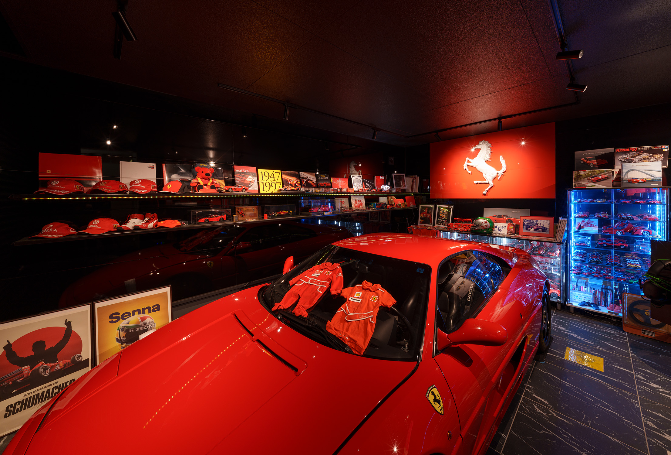 愛車を2台格納できるガレージを設置。愛車とコレクションが並ぶ、N様の夢を形にした特別な空間
