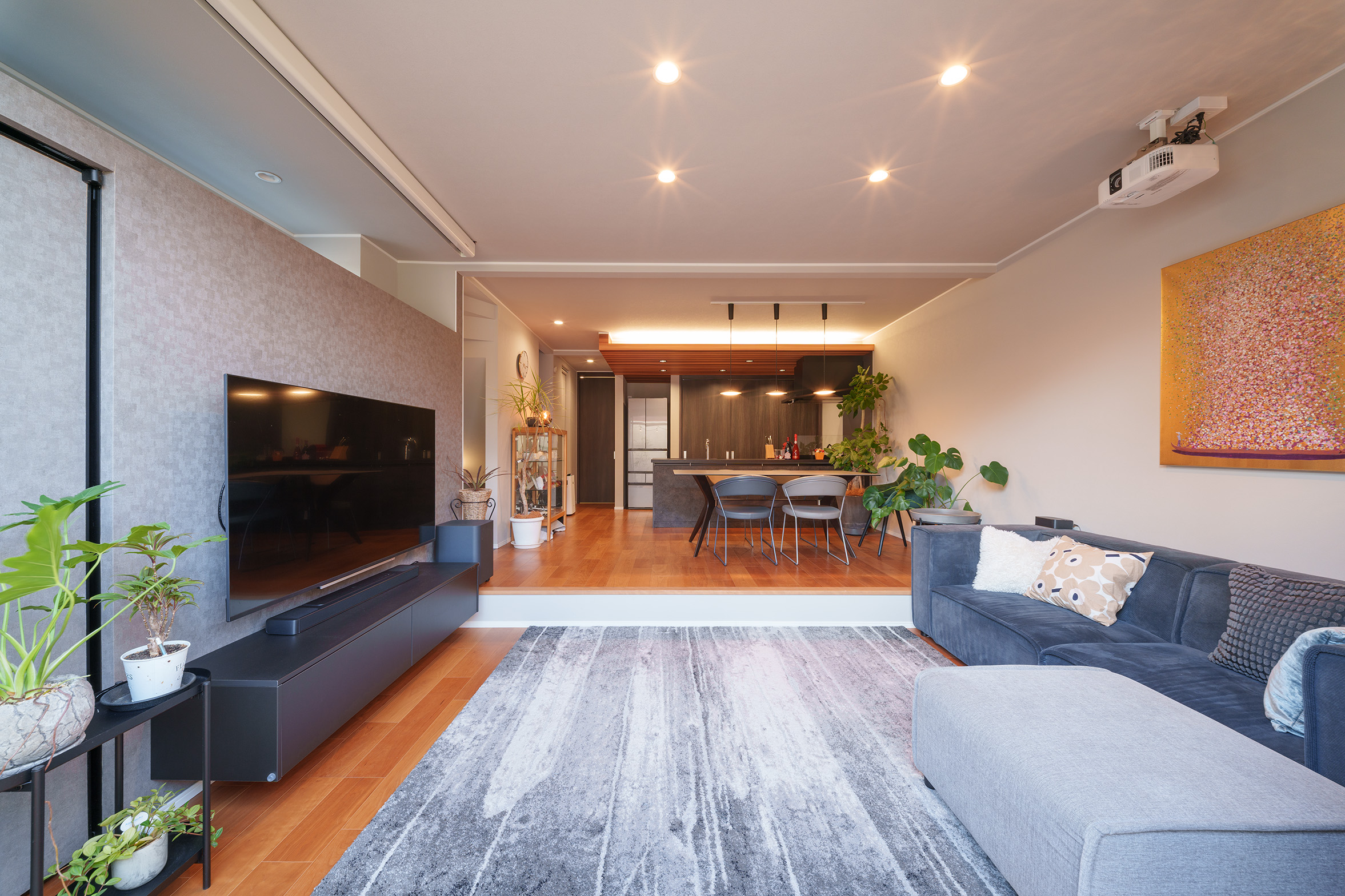 プロジェクターで迫力の映像が楽しめるリビング