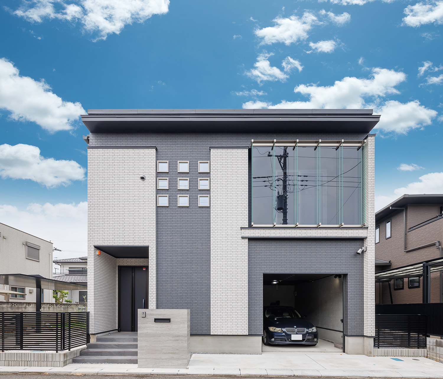 モデルハウスのような磨き抜かれた外観。窓越しに愛車が見下ろせるサロンを設置