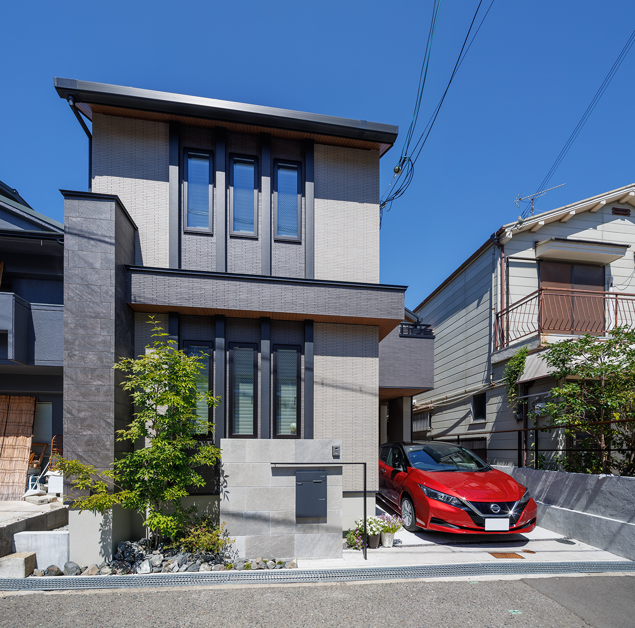 タイルとガラスパネルが目を引く外観の二世帯住宅