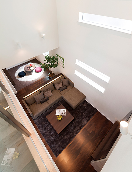 たてに広がり、開放感を演出する吹抜のあるリビングで家族の会話も弾みます。