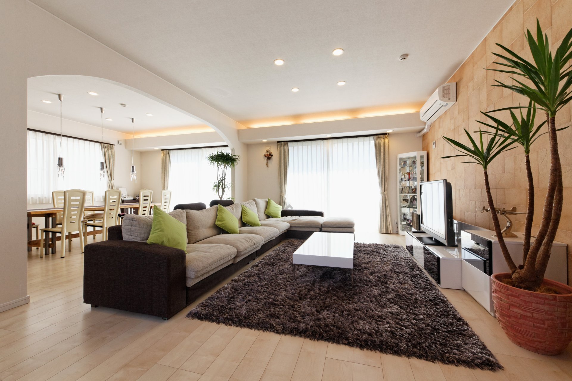 約36帖の広さを確保したゆとりあるLDKはご家族が自然に集まる空間。リビングとダイニングの間の曲線を描く垂れ壁や間接照明がアクセントに。