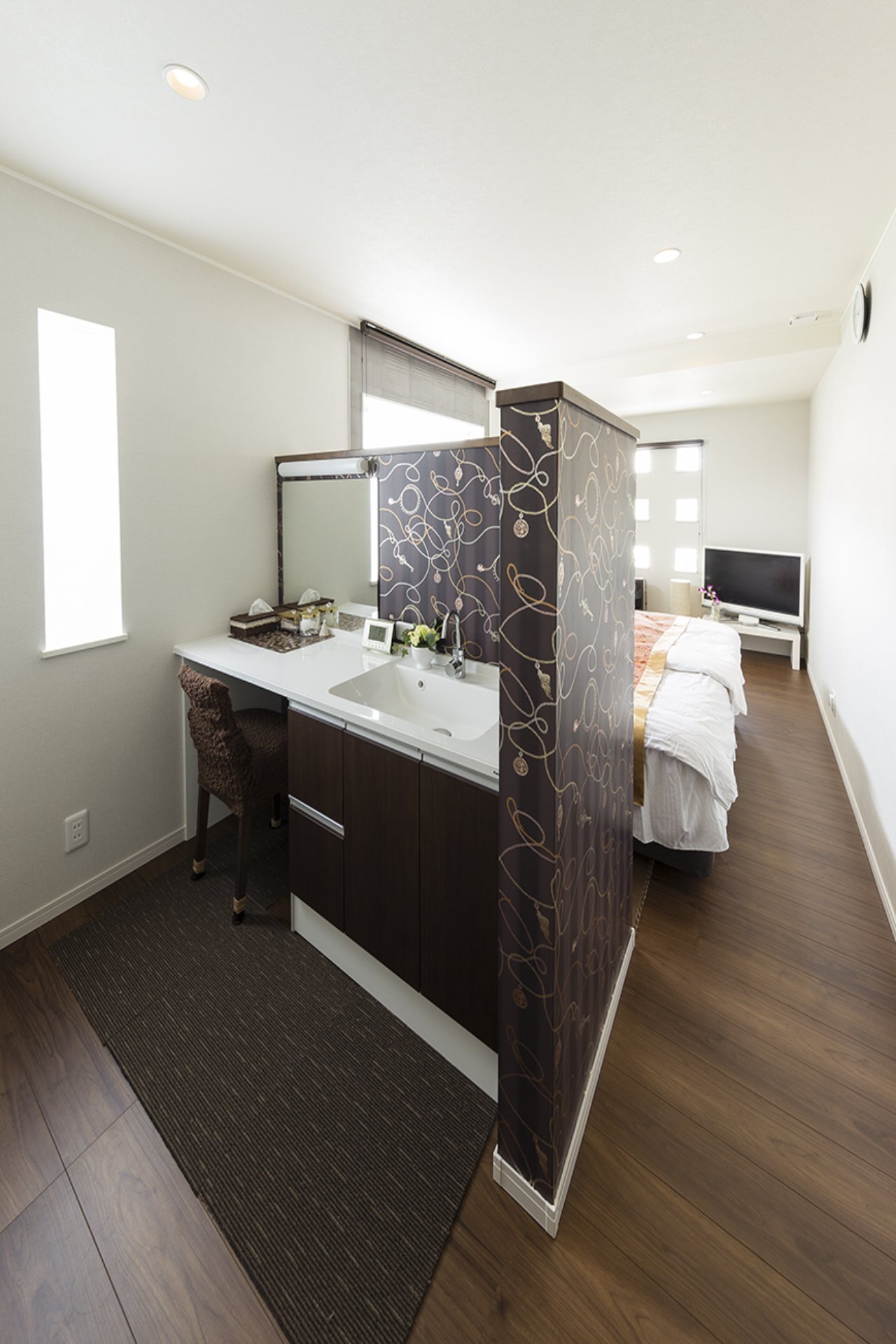 シックなテイストの主寝室。壁の向こう側がメイクスペース