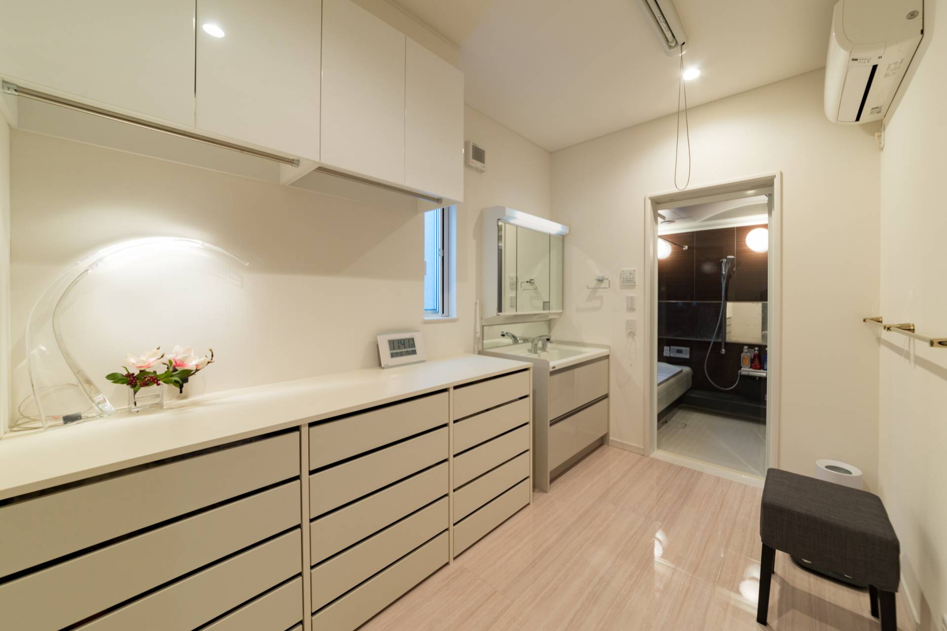 造作家具や室内物干しユニットで家事に配慮した洗面