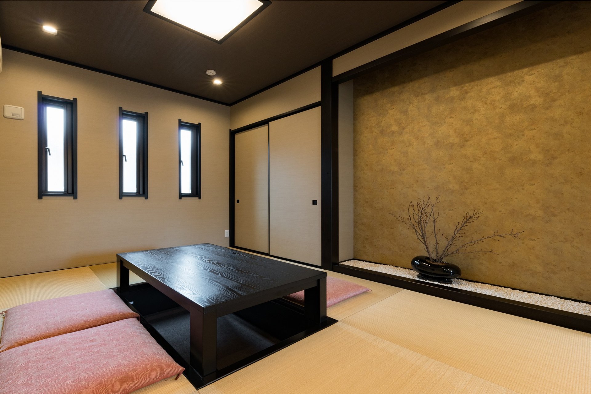 上質なフローリングやテレビ背面の石張りの壁、こだわりの照明がつくりだす高級感のあるリビング