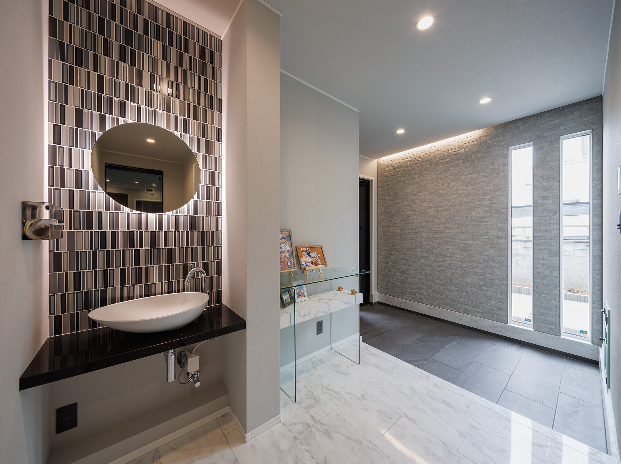 玄関ホールに帰宅時の手洗いに使う洗面台を設置