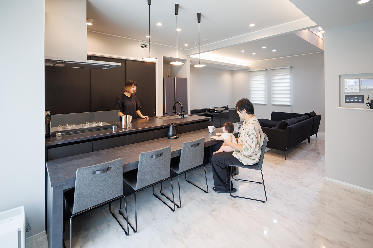 上質な空間に似合う住友不動産ハウジングオリジナルのキッチンを採用。キッチン前のテーブルも造作。