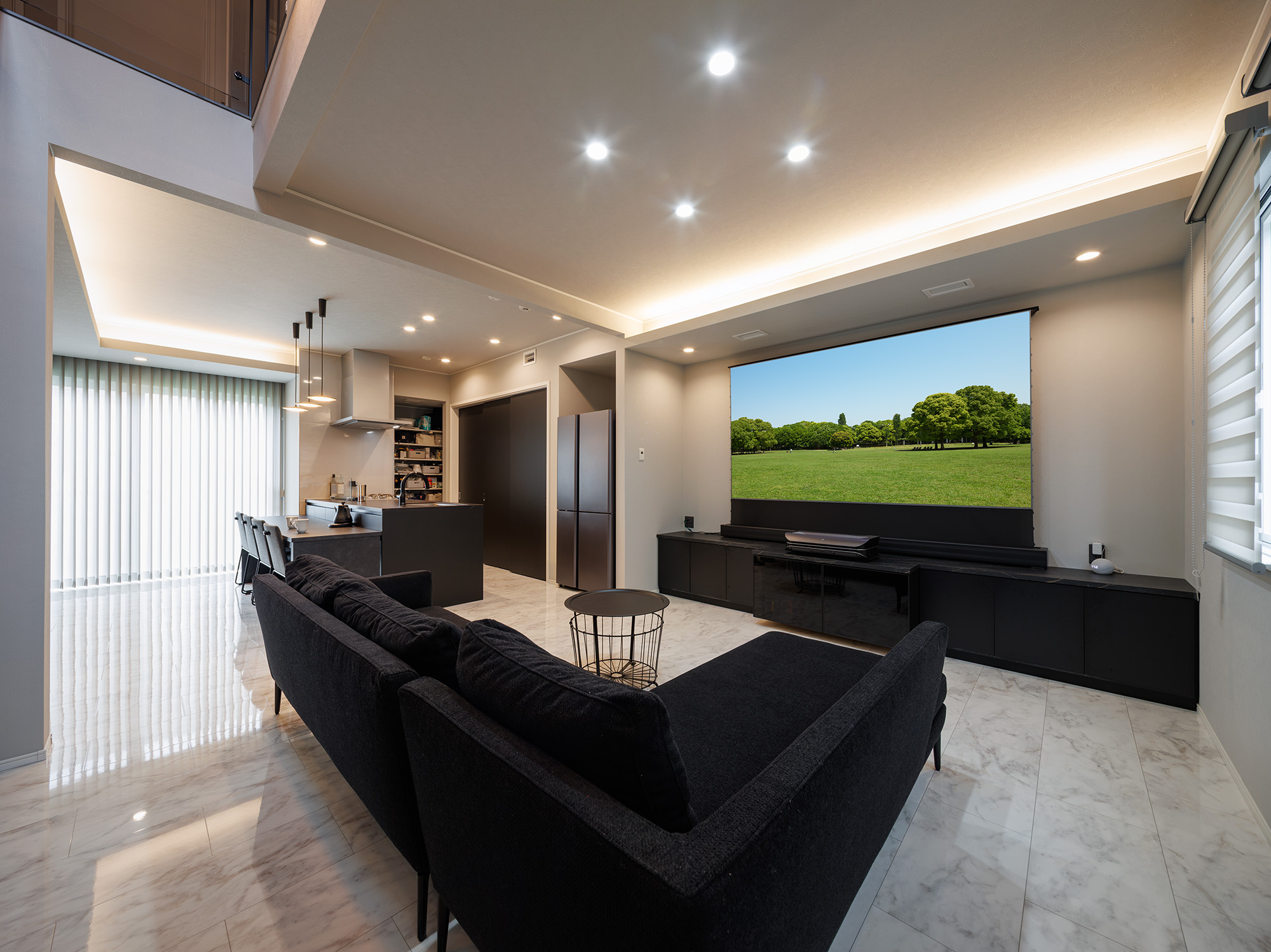 プロジェクターの大画面で映像を楽しむリビング