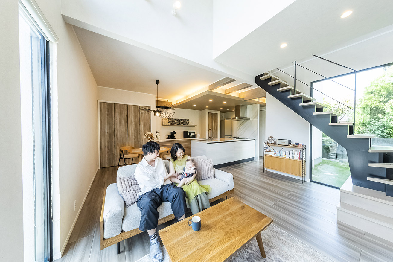 明るく開放感のあるLDKにスケルトン階段が映える、ご夫妻のセンスが凝縮されたお洒落な住まいが完成