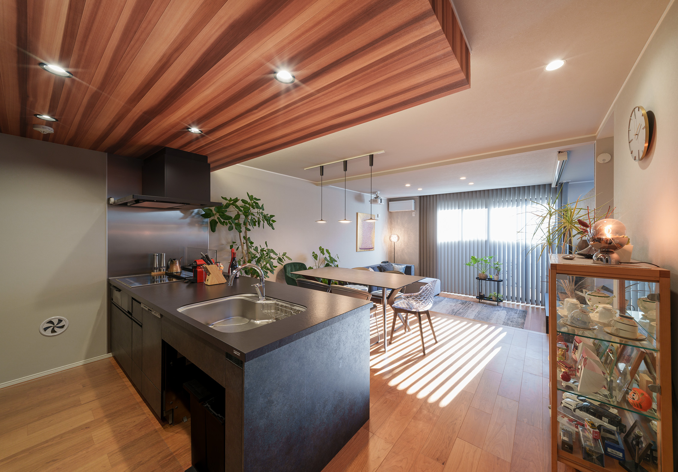 上質感と木のぬくもりが融合した2階のLDK。ダウンフロアリビングにより、ダイニングの床が腰掛けとしても使える、多様な居場所を備えた空間に