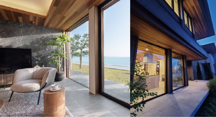 建物の正面と海側にそれぞれテラスを設け、人と人とがふれ合いながら自然を享受できる縁側のような空間とした。床と同レベルで続くテラスは屋内の延長として使用でき、外気を感じながら過ごせる心地良い中間領域となっている。 -